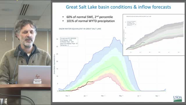 Jordan Clayton, supervisor of the Utah Snow Survey, presented historical inflow and storage figures for the Great Salt Lake and said projections point to substantially below-average inflow for 2026. "We anticipate the 2026 inflow to be substantially lower than average," Clayton said.