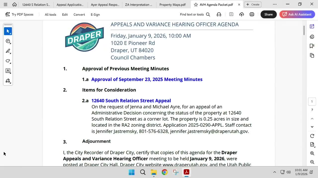 A pair of homeowners and their counsel told a Draper appeals and variance hearing on Jan. 9, 2026, that the city's zoning administrator incorrectly classified 12640 South Relation Street as a corner lot and that the determination should be reversed.
