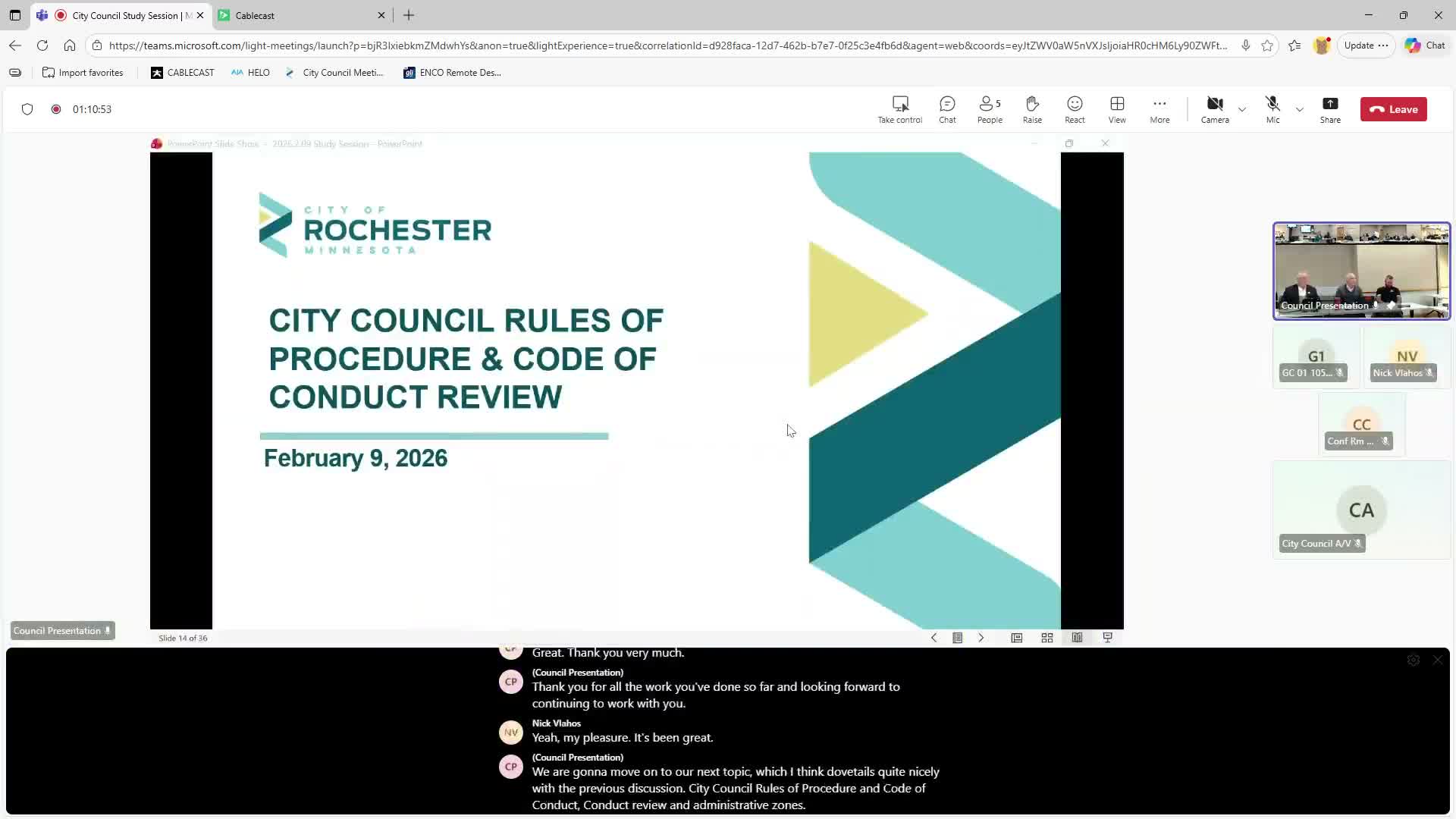 Council reviews rules of procedure, debates remote participation and council-initiated actions; schedules options and moves to closed session