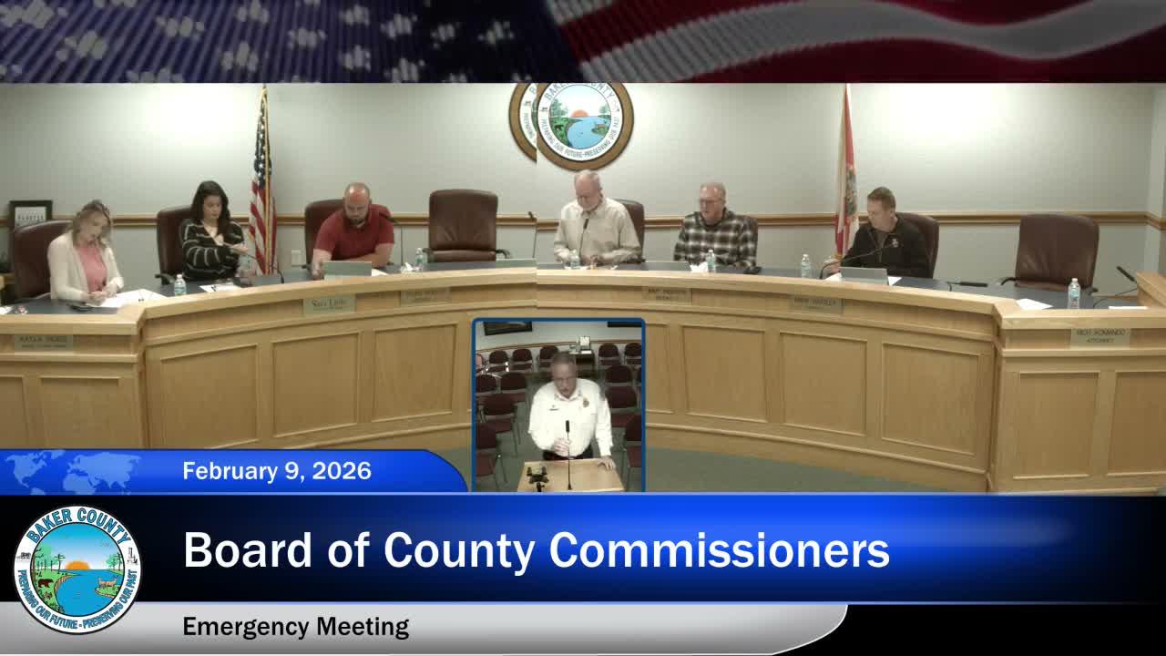 At an emergency meeting of the Baker County Board of County Commissioners, a fire chief (Unidentified Speaker 4) told the board that about one-third of the county is in 'extreme drought,' that several recent fires have affected mostly forested areas, and that some of those fires were preventable. 'I'm asking for you to reinstate the burn ban for Baker County, until we get some significant rain,' the chief said.