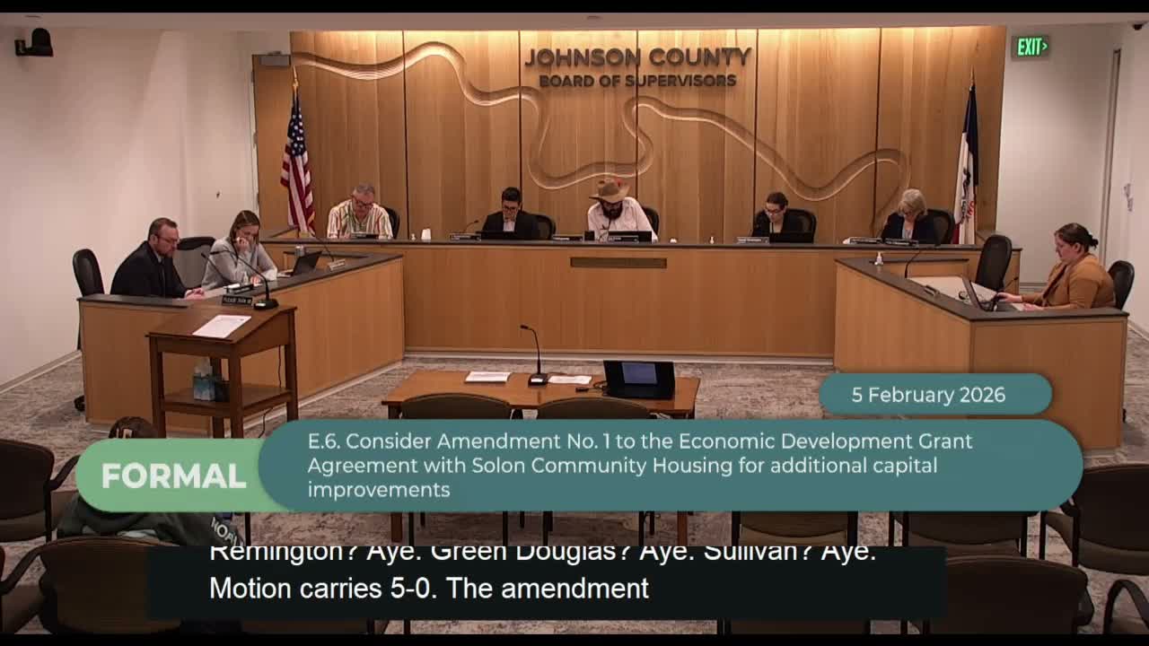 The Johnson County Board of Supervisors voted unanimously Feb. 5 to adopt a resolution urging Congress to withhold additional Department of Homeland Security funding without ‘‘meaningful and significant guardrails,’’ and also approved a series of routine contracts, a site plan, and grants during a largely unanimous session.