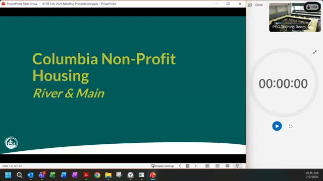 Grace Dudley of Columbia Nonprofit Housing updated the board on River & Main, a 40‑unit senior rental project proposed for downtown Washougal. Dudley said 50% of units would be restricted at 30% of area median income (AMI) and 50% at 50% AMI, with universal design features and on‑site services. River & Main previously received $300,000 in HOME funds; Dudley said the project now needs an additional $400,000 in HOME funds after Section 202 federal funds became unavailable.