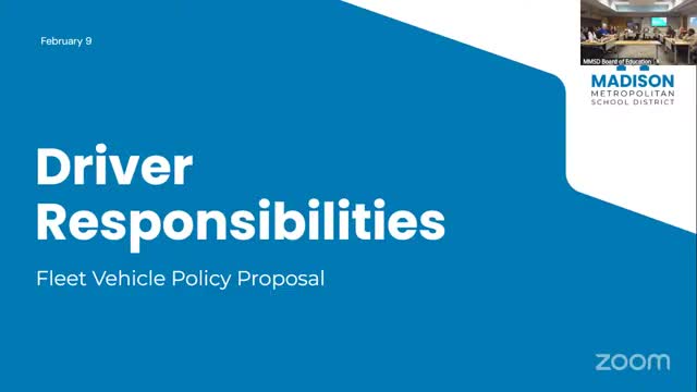 Madison Metropolitan School District staff presented a new driver responsibilities (fleet) policy at a Feb. 9 second read, saying the district previously lacked a formal board policy governing vehicle use. Vanessa Cruz, assistant director of transportation and logistics, said the policy will standardize expectations, require driver license verification and background checks and make employees personally responsible for traffic and parking violations incurred while operating district vehicles.