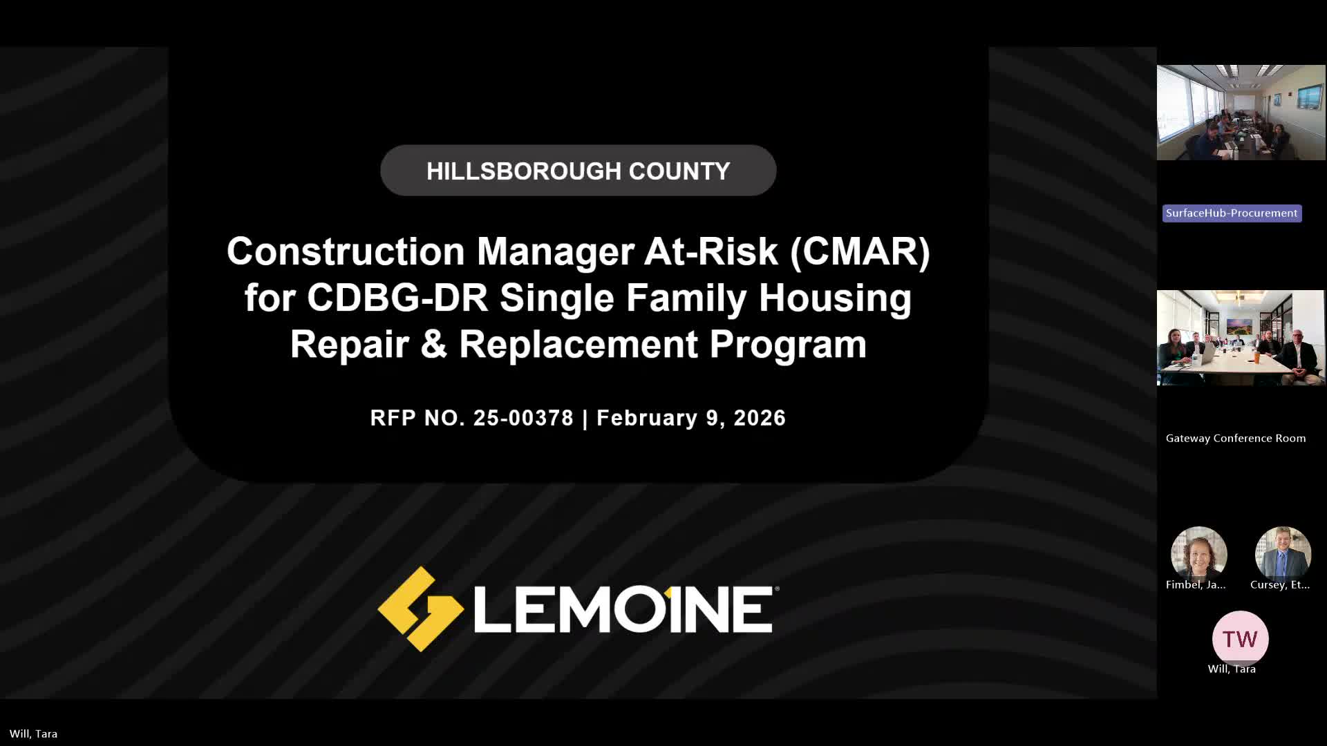 LeMoyne presented as prime construction manager for Hillsborough County's CDBG-DR single-family housing repair and replacement RFP, emphasizing a trauma-informed homeowner approach, rapid cycle times, integrated documentation in Canopy, local subcontractor outreach and warranty processes; committee questioned local staffing and production metrics.