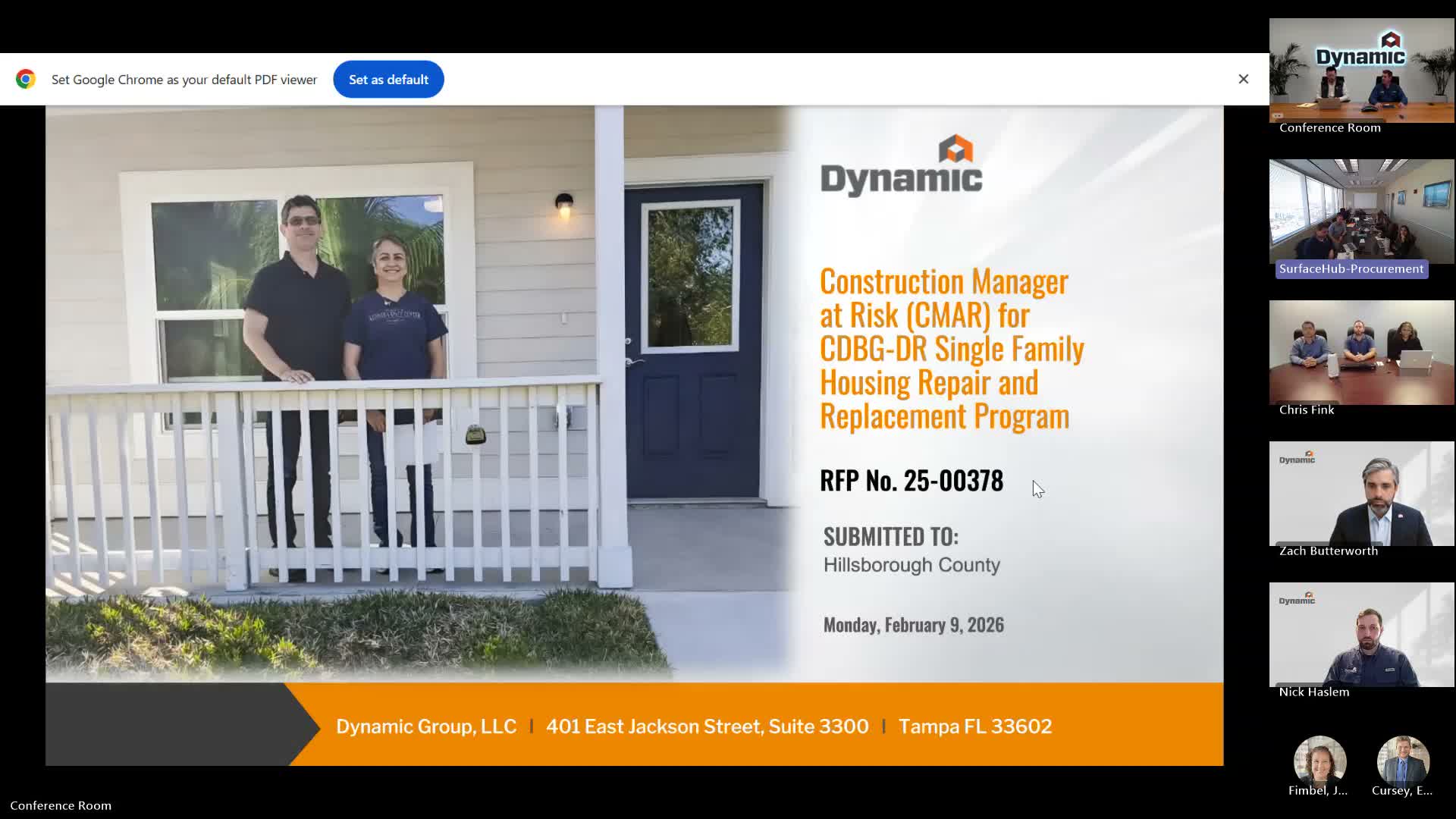Dynamic, a disaster-recovery construction contractor, told a Hillsborough County selection committee that it has the experience and local partnerships to deliver the county's CDBG-DR single-family housing repair and replacement program under RFP 25-00378.