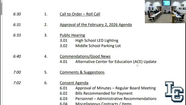 Board hears public testimony on high‑school LED lighting and middle‑school parking lot estimates