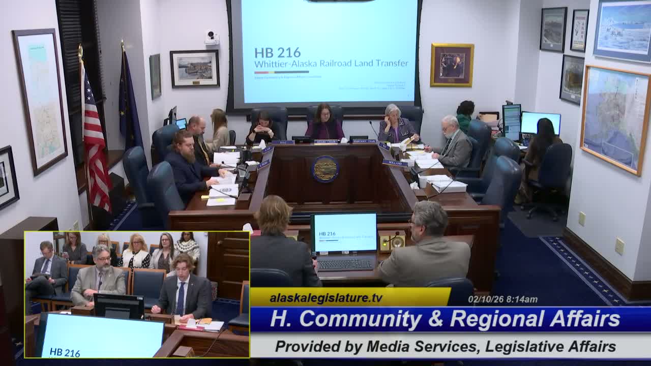 House Bill 216 would authorize the Alaska Railroad to transfer specified parcels to the city of Whittier (three parcels currently proposed for sale, authorization language covers five parcels). Railroad and city witnesses said board approval and due diligence remain required; the committee set the bill aside for later action.