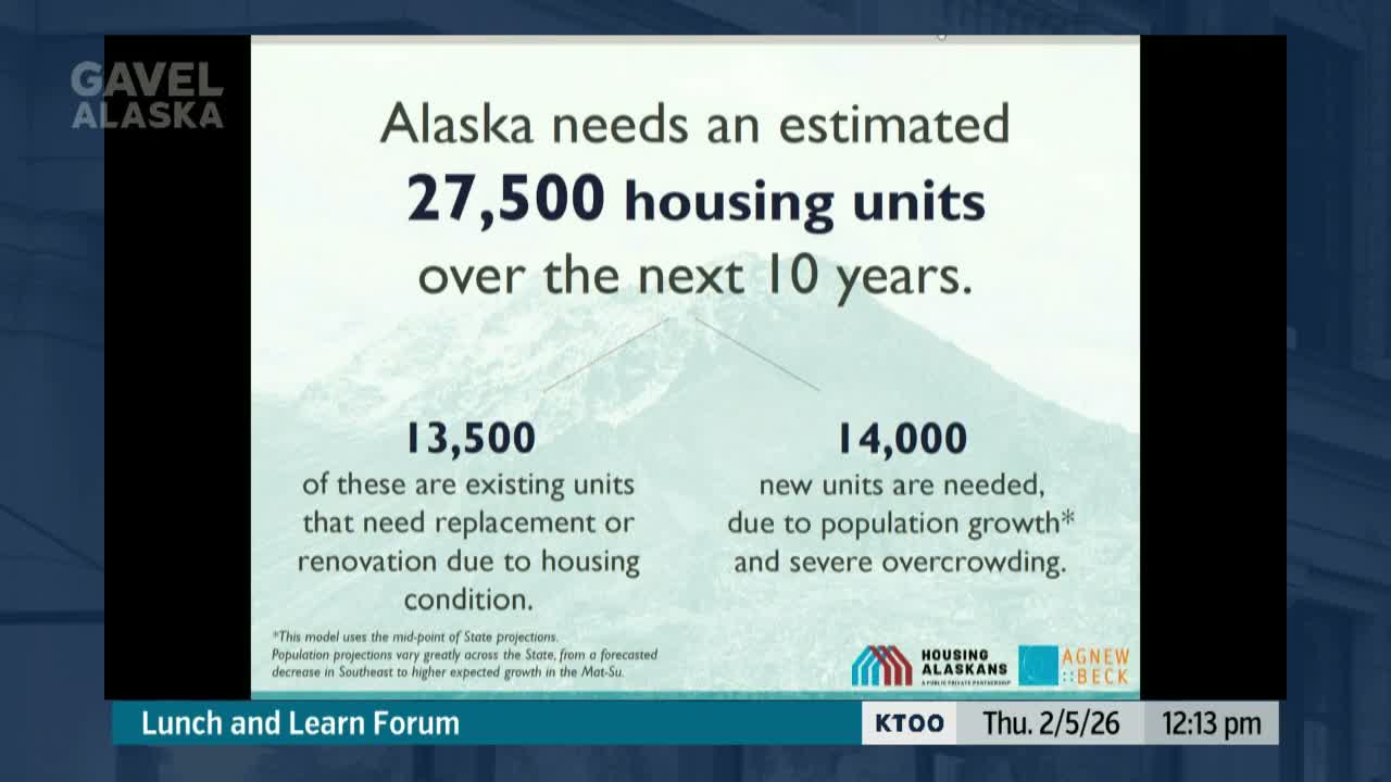 Speakers emphasized the scale of the housing shortfall. “Alaska needs over 27,000 housing units over the next 10 years just to meet the existing need for housing,” a presenter said, adding roughly half of the need is for replacement or renovation rather than purely new construction.
