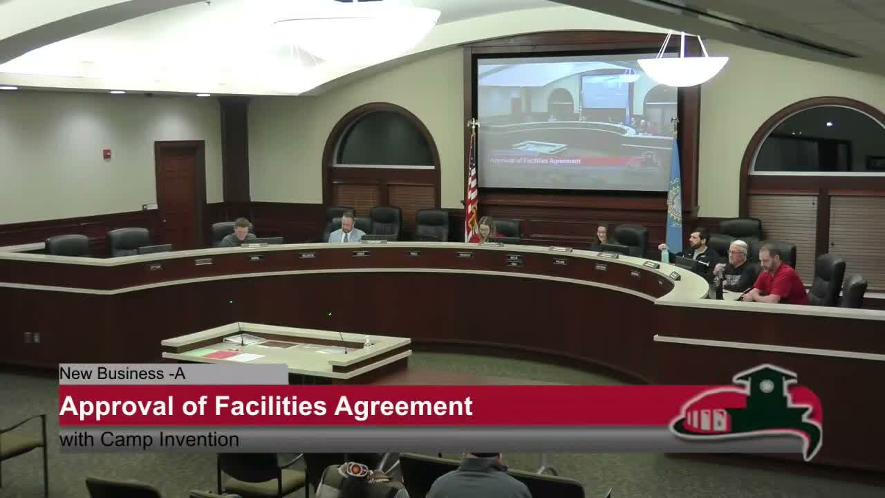 Facilities: The board approved a facilities agreement to host Camp Invention at the elementary school; Mindy Whistler requested a fee waiver for the program that had 27 campers last year and hopes to reach 40 this year. The board also discussed and approved facility-use requests from the youth wrestling program (tournaments Feb. 15 and a district-hosting event March 7); administration confirmed custodial staffing and said custodial fees would remain while other fees could be waived.