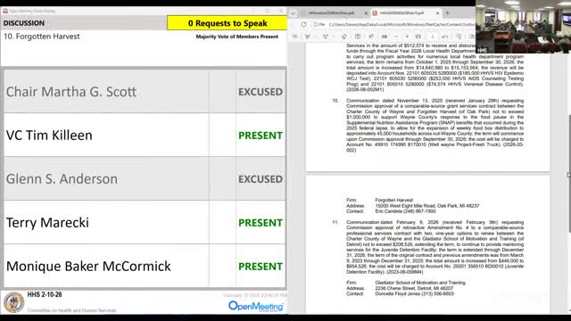 The Health and Human Services Committee approved a $1,000,000 comparable-source agreement with Forgotten Harvest to expand weekly food-box distributions to up to 45,000 Wayne County households, funded from county general/post-ARPA dollars; commissioners asked about sustainability and lines at pantries.