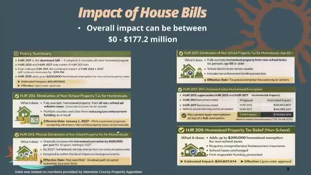 Manatee County officials spent the bulk of a work session explaining how a wave of state‑level and ballot-driven proposals could sharply reduce county property‑tax revenue and force hard choices about services.