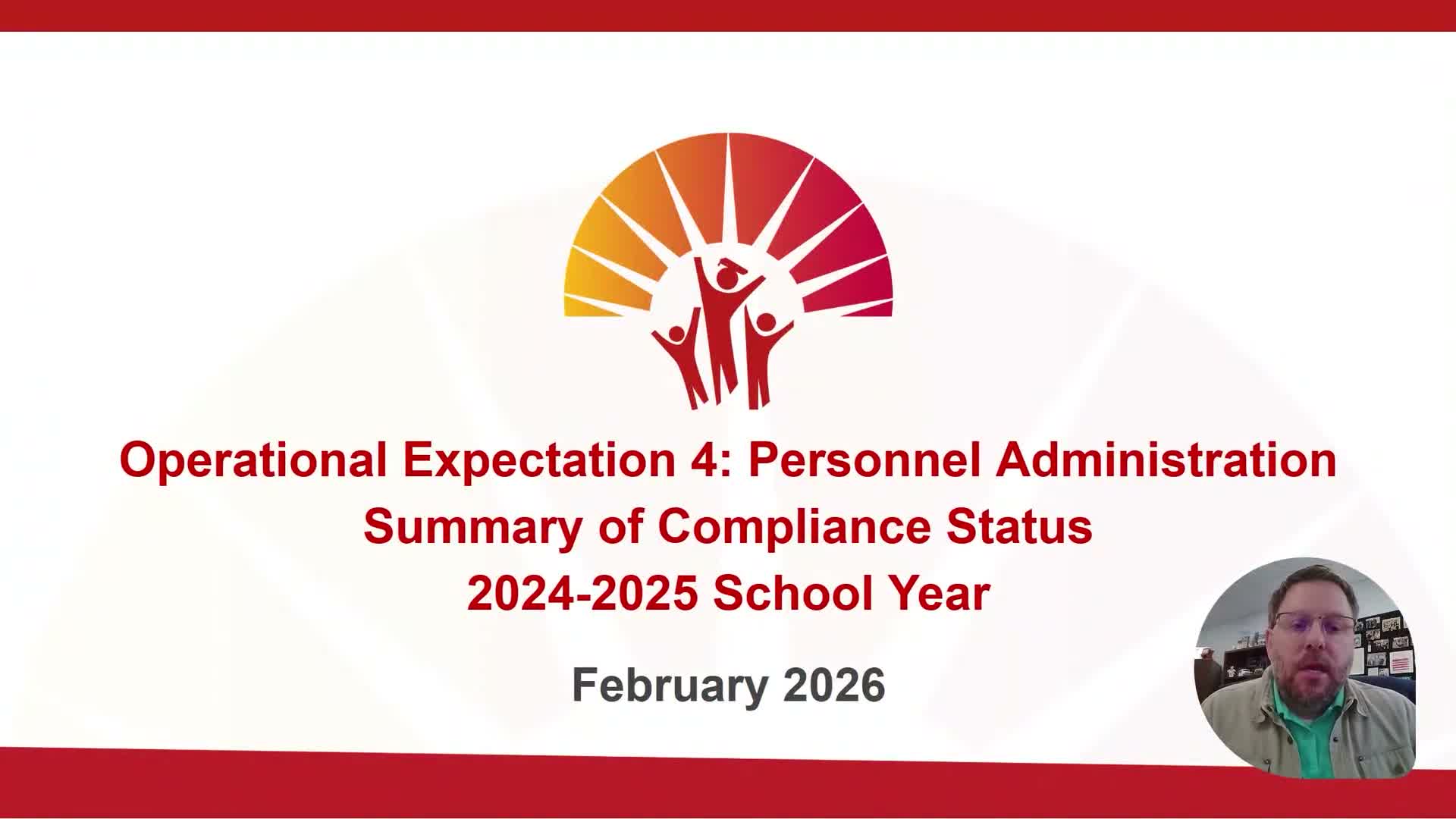 Nick Rykoff, assistant superintendent of operations for the Sun Prairie Area School District, told the school board that the district's monitoring review of Operational Expectation 4 (Personnel Administration) found 31 of 35 measures compliant but identified four noncompliant measures that warrant further action.