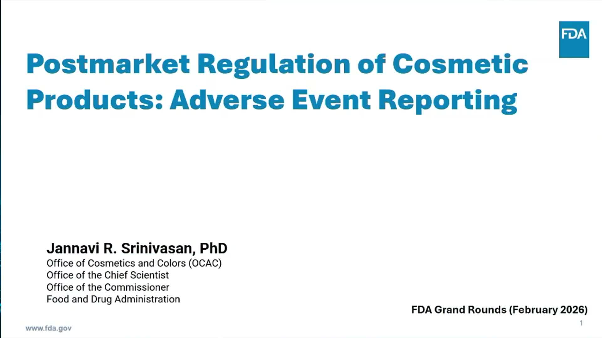Janavi Srinivasan, Director of the Division of Cosmetics at FDA, reviewed postmarket surveillance tools and the agency’s expectations for adverse‑event reporting under MOCRA.
