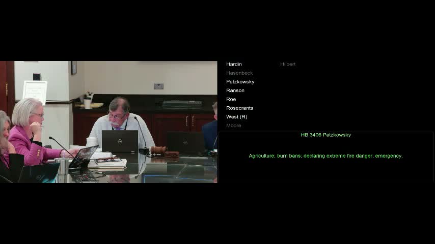 HB 3,406, adopted as a PCS, would change burn‑ban statutes including shortening a waiting period after rain from 14 to 8 days; sponsors said the change was requested by a county commissioner and that the U.S. Drought Monitor is the intended federal reference for drought data.