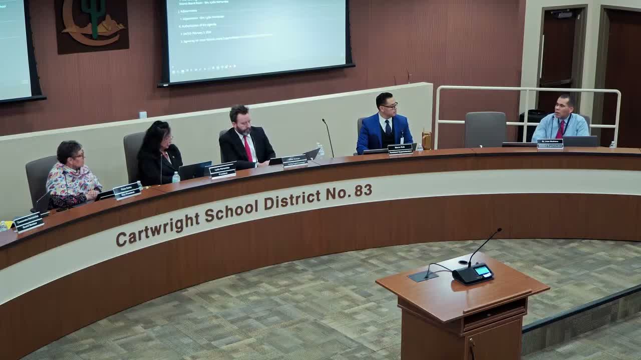Dr. Medrano briefed the Cartwright board on the district’s recent HVAC procurement and funding. He said the HVAC upgrades were part of a broader energy-conservation measures package approved in September 2020 and financed through a lease‑purchase agreement; approximately 540 units were financed via that lease purchase, and an additional 444 units were purchased using ESSER grant funds.
