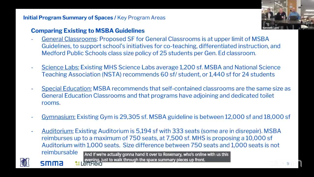 Consultants and district staff presented a detailed space summary for the Medford High School PDP and fielded questions about classroom sizing, CTE expansion and reimbursement from the Massachusetts School Building Authority.