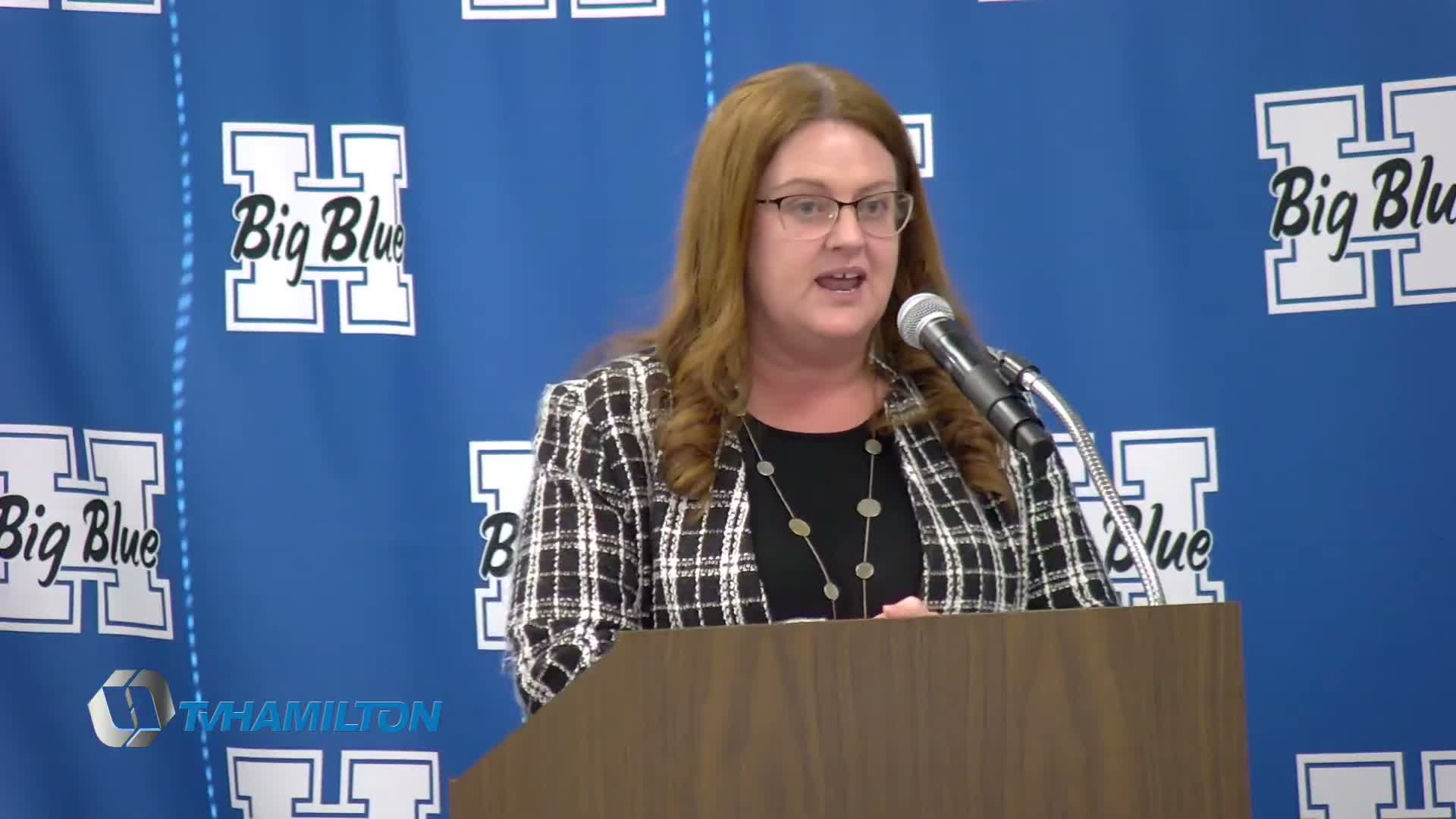 A New York Life representative presented a ceremonial check and noted the local need. Carol Merrill said it was "our honor to present a check to Hamilton City Schools in the amount of $6,500 from the New York Life Foundation" and emphasized the importance of school-based grief supports. Another presenter cited statistics discussed at the meeting, noting that roughly 1 in 10 children will experience the death of a parent or sibling before age 18 and that bereavement can increase suicide risk.