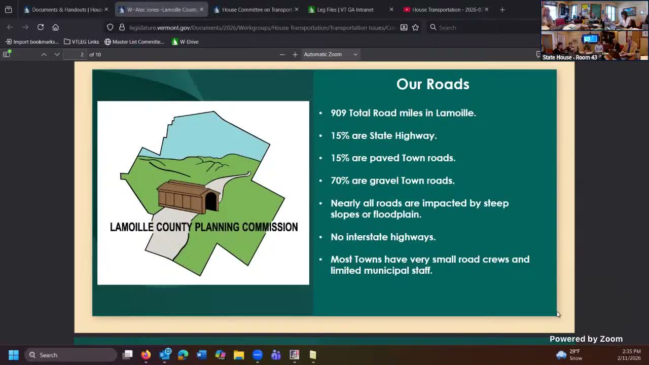 Regional planning commissions told the House Transportation Committee on Feb. 11 that rural road networks and flood-resiliency projects require continued technical assistance and easier access to grant funds; presenters highlighted a long hydraulic model and successful pilot projects but warned of municipal capacity limits.