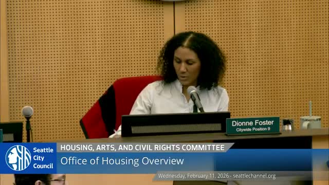 The Seattle Social Housing Developer presented an organizational and financial update to the Housing, Arts and Civil Rights Committee on Feb. 14, laying out staffing, governance, financing and production targets as the agency prepares to receive initial payroll‑tax proceeds.