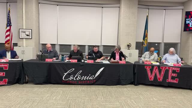 The Colonial School Board approved an amended 2026–27 meeting calendar at its Feb. 10 session after discussion of an added agenda item to move a meeting originally scheduled for May 12 to May 5.