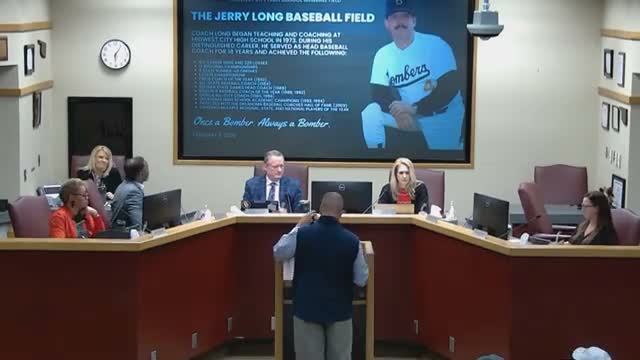 At the start of the meeting community members asked the board to designate Midwest City High School’s baseball field as the "Jerry Long Baseball Field." A presenter outlined Long’s tenure beginning in 1973, citing 41 victories in a season, 12 regional championships, multiple state runner‑up finishes, one state championship, statewide coach awards and induction into the Oklahoma Baseball Coaches Hall of Fame in 2009. Alumni praised Long’s commitment to discipline and mentorship. The board moved to approve the designation and the motion passed; the record notes that a board member (doctor Kirk) recused herself during that vote.