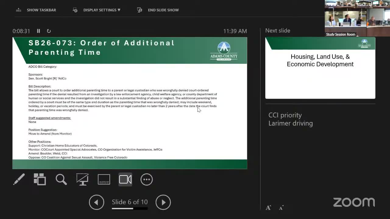 Adams County staff and commissioners agreed to pursue amendments to Senate Bill 73, a measure that would allow courts to order additional parenting time when a parent's time was wrongfully denied as a result of an investigation and there was not a substantial finding of abuse or neglect.