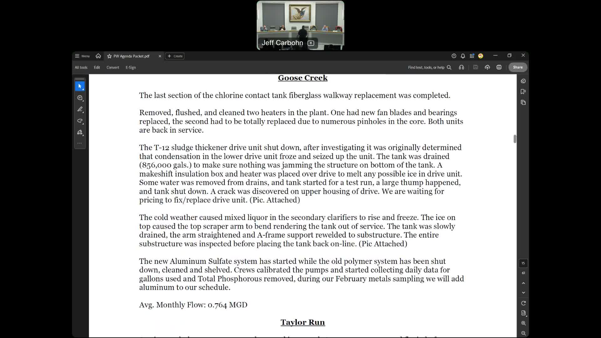 Average flows reported in the meeting were 764,000 gallons per day at the Goose Creek plant and 703,000 gallons per day at Taylor Run. Mitchell noted other cold‑weather impacts — frozen pressure relief valves, polymer line freezes and failed generator batteries — and said teams performed in‑house repairs where possible.