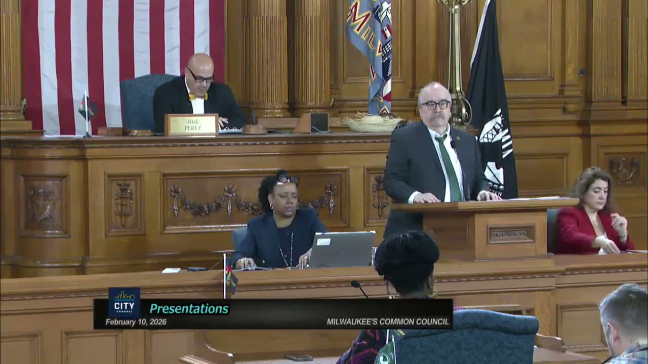 The council presented a ceremonial recognition to Peter Fagan for his role in the Milwaukee Bucks' championship run and community philanthropy; Fagan thanked the council and said the honor was deeply meaningful, adding, "This is where the sausage is made." The council also presented a resolution congratulating Reuben Harpole for decades of community work preserving African American history and noted the city's 100th anniversary observance of Black History Month.