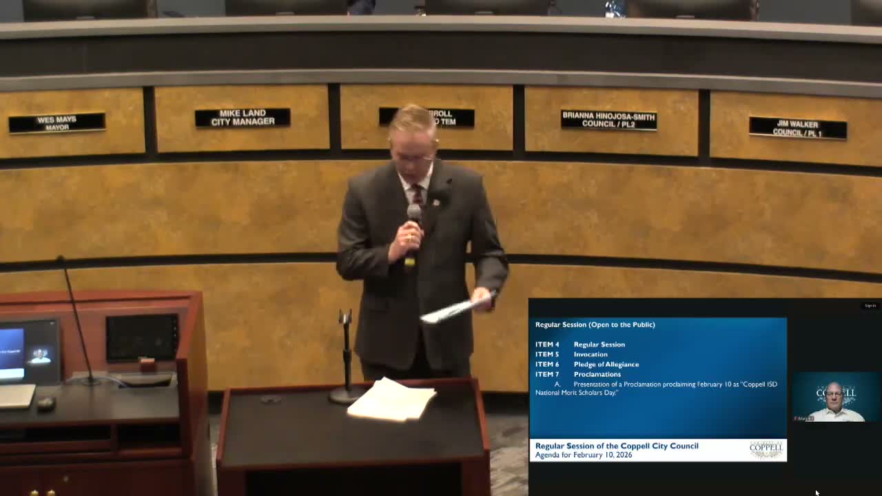 Mayor Wes Mays read a proclamation naming Feb. 10, 2026, as National Merit Semifinalist Recognition Day to honor Coppell Independent School District students who achieved semifinalist status. Council members congratulated the students and invited finalists forward for a group photo.