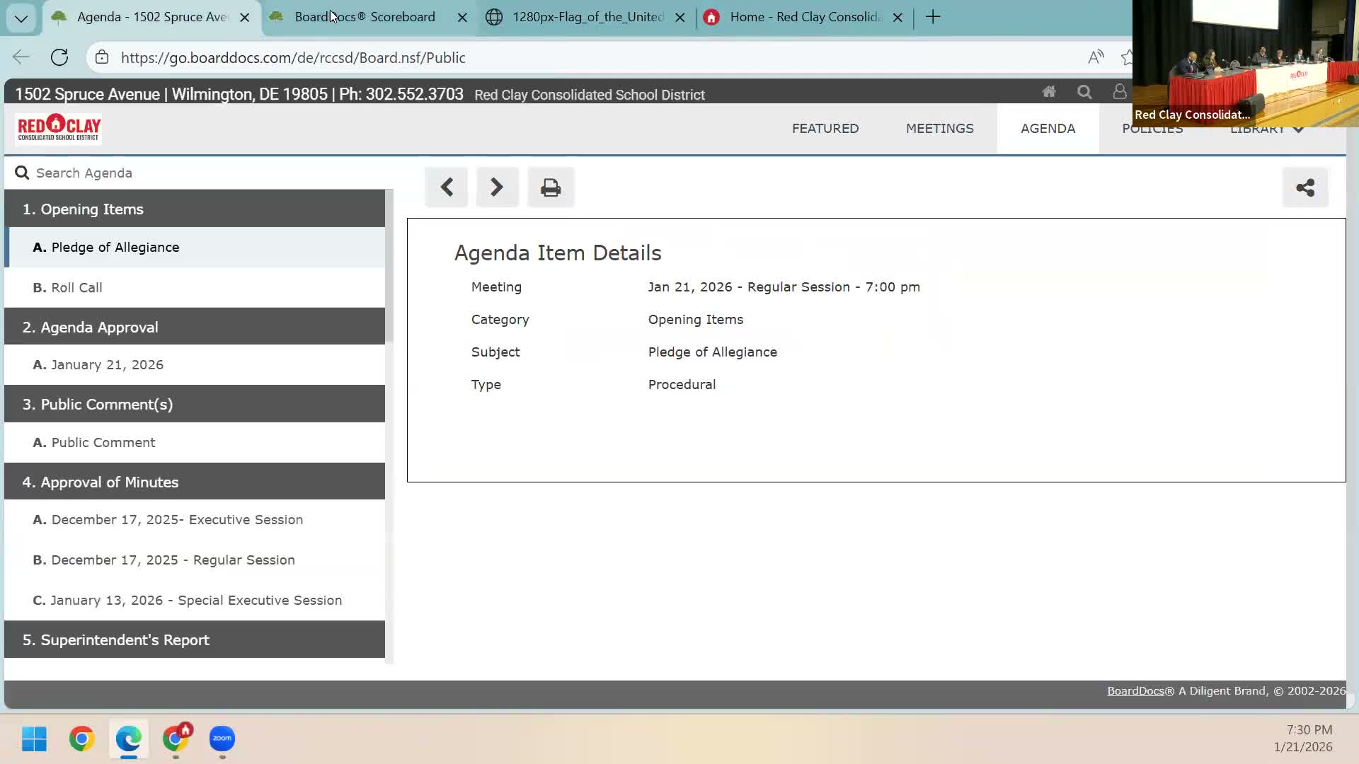 The Red Clay Consolidated School District Board of Education on Jan. 21 approved revised board policies, authorized transfers among major capital improvement appropriations and accepted design plans for three schools, with most action items passing by 6–1 roll-call votes.
