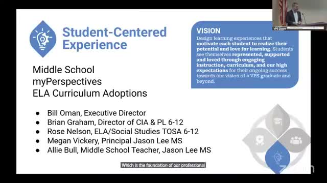 The Vancouver School District presented a strategic‑plan‑linked recommendation to adopt a new middle‑school English language arts curriculum. Brian Graham and Rose Nelson described a committee of 25 (teachers, multilingual specialists, special‑education educators, counselors, administrators and parents) that reviewed five full curricula, ran a six‑week pilot in classrooms, and voted 25‑0 to recommend the selected curriculum. Presenters emphasized unit structure (whole‑class instruction, peer collaboration, independent inquiry), frequent performance tasks with multiple demonstration modalities, embedded supports for multilingual students and special education, and a professional learning rollout including training days and ongoing PLCs. Classroom teachers reported higher volumes of student writing, structured conversations to increase elaboration, scaffolded vocabulary supports and use of rubric‑aligned AI feedback in the My Perspectives platform as a formative tool.