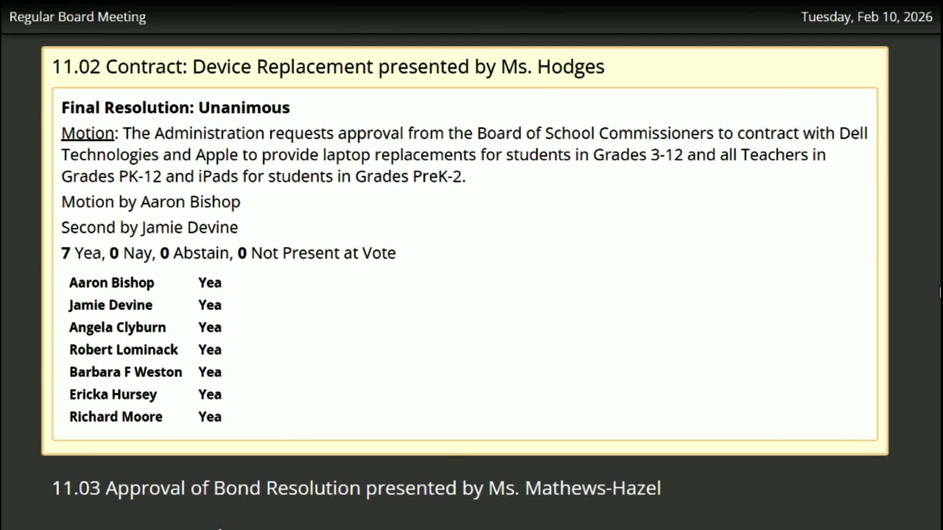 The board approved a resolution authorizing up to $27 million in general obligation bonds to fund technology, construction, equipment and vehicles; administration said bonds will be paid in full by March 1, 2027, and that taxpayers will not see an increase.