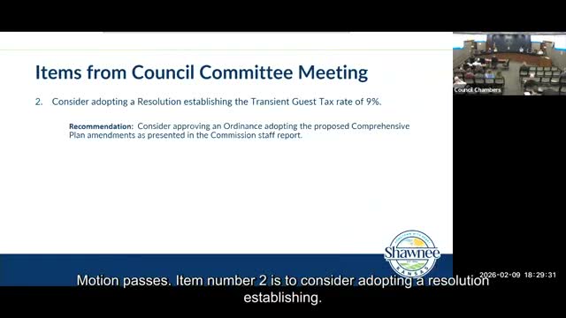 The Shawnee City Council voted Feb. 9 to raise the city's transient guest tax from 8% to 9%, a move staff said would generate roughly $115,000 annually and provide additional revenue for tourism and economic development programs including a temporary World Cup transit circulator.