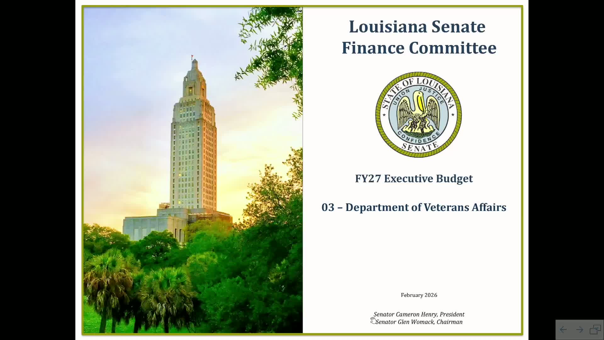 Senate Fiscal Services presented the Department of Veterans Affairs's FY'7 budget and programmatic data, and department officials answered lawmakers'questions about veterans homes occupancy, reimbursement rates and a separate National Guard disability claims program.