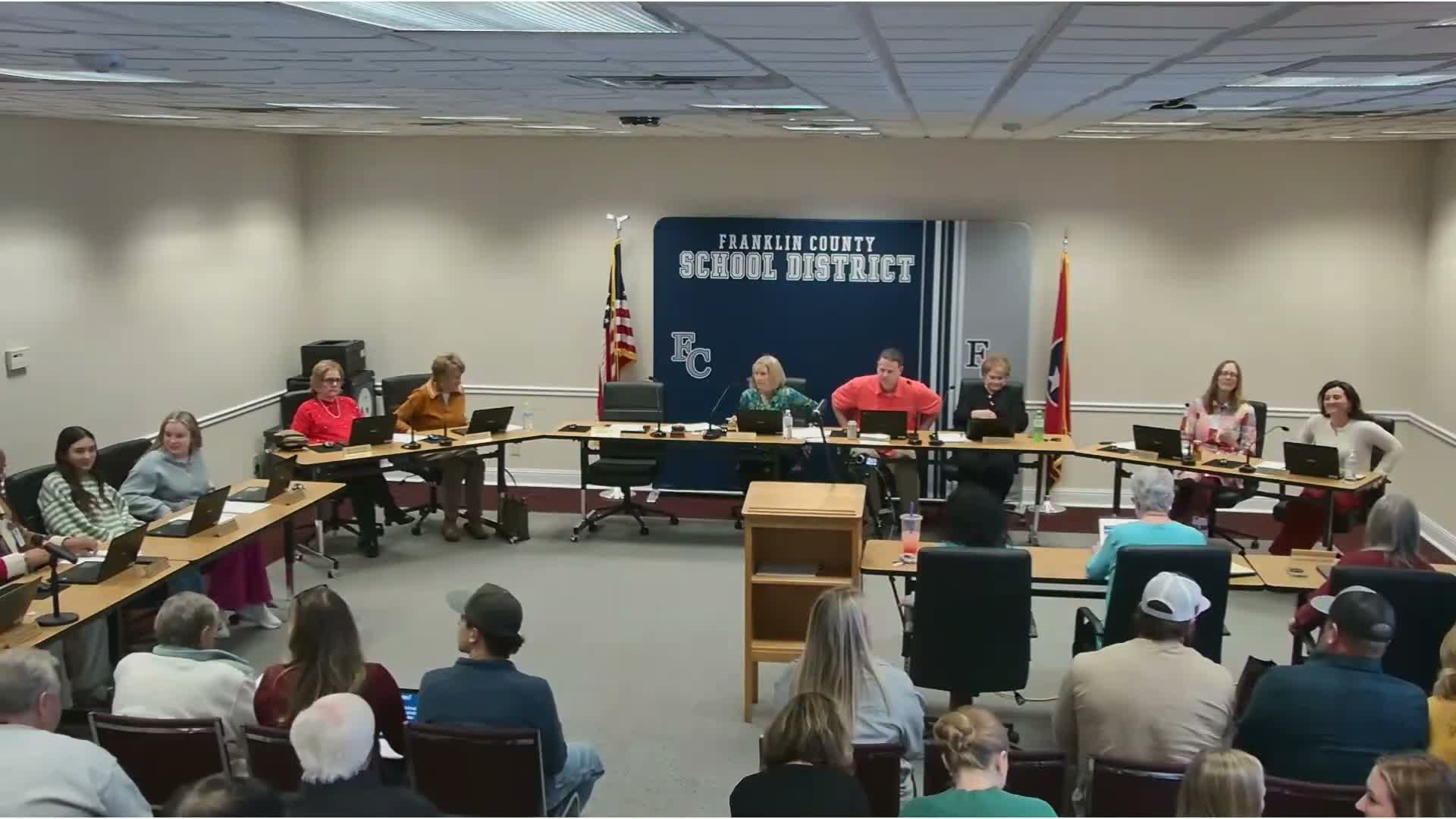 The Franklin County School Board voted to recommend a candidate for director of schools and gave the board chair authority to negotiate a contract. The meeting included multiple voice votes approving routine consent items, a budget amendment and a personnel policy update.