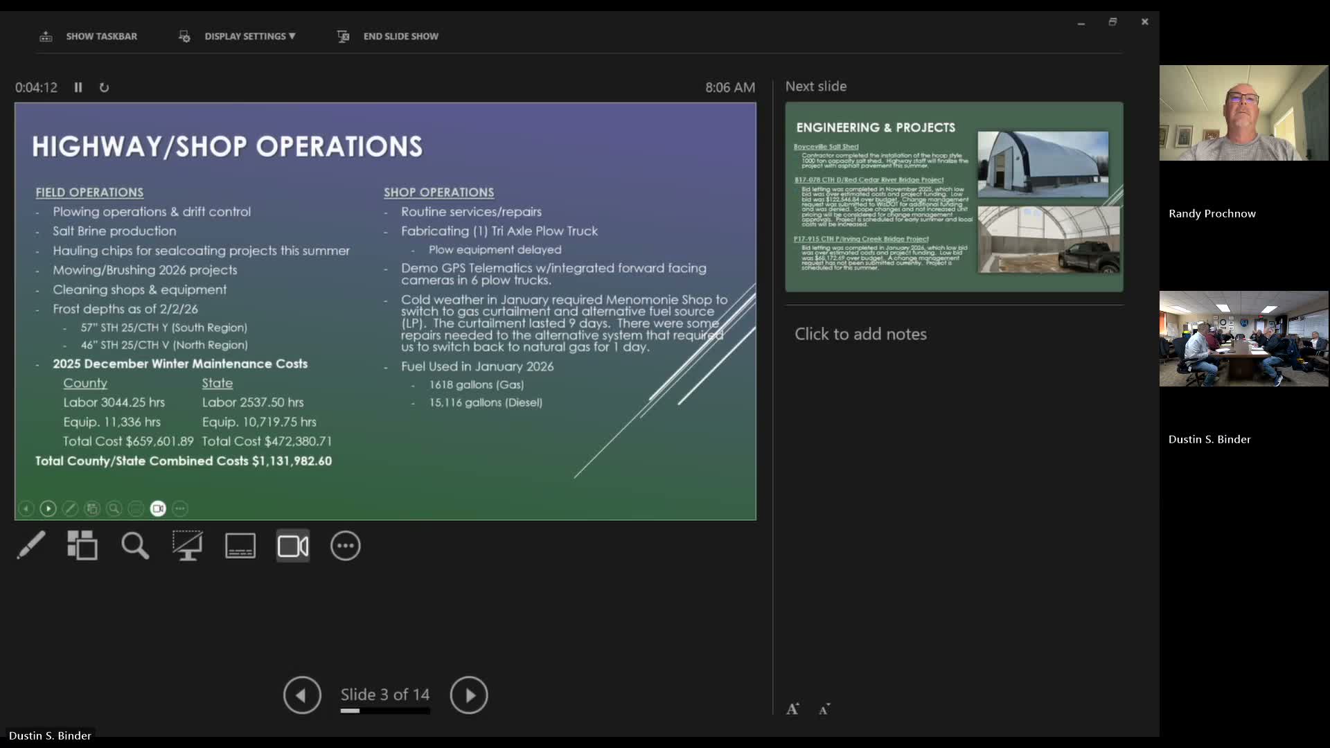 Committee members voted to accept the five-year capital road-and-bridge improvement plan for 2027'231, which staffs said emphasizes about 16'17 miles of paving annually to sustain a 25-year pavement life. Speaker 1 told the committee that the 2028 program could total about $6.8 million before potential state or federal grant offsets. "If we were allotted that project [County Road B], we might only have to pay $400,000," Speaker 1 said, referring to potential grant funding that would reduce county share.