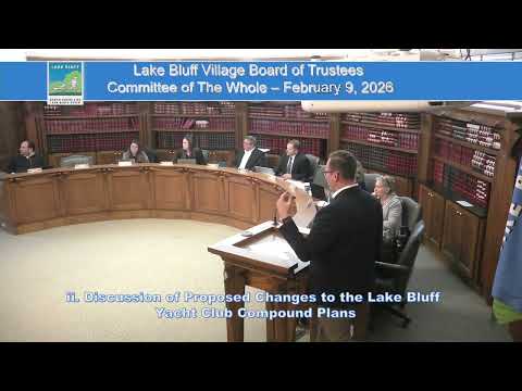 On Feb. 9 the Village of Lake Bluff Committee of the Whole heard a presentation from the Lake Bluff Yacht Club on proposed changes to its lakefront compound, including a condensed single‑story boathouse, new rack storage for club‑owned kayaks and paddle boards, and a decorative fence along the beach.