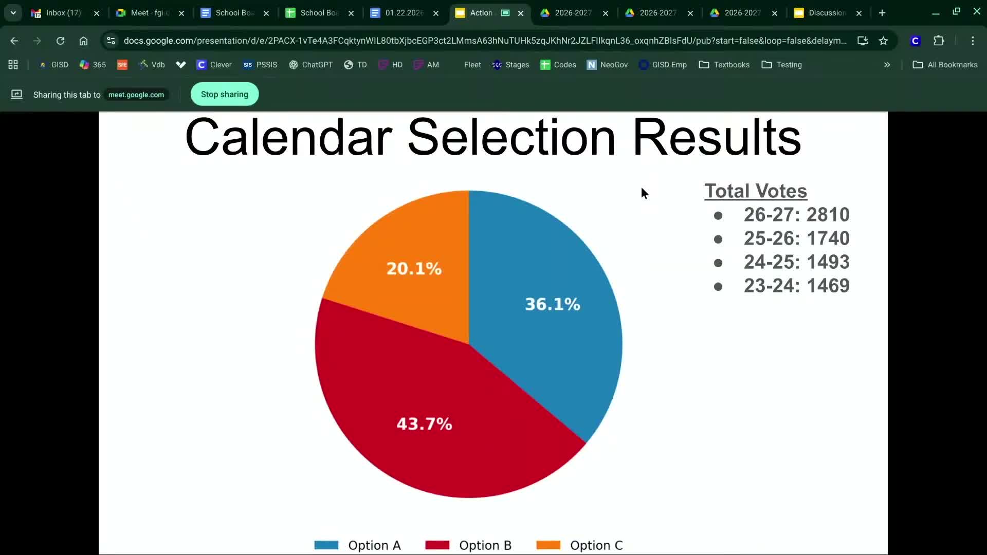 The vote concludes the calendar-selection agenda item; staff will finalize and publish the adopted calendar and notify campuses and community partners.