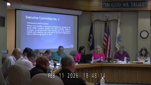 The executive committee reviewed renewals for employee health, dental and life insurance and property/liability coverage. Brokers said the parish’s prior carrier was withdrawing abuse/molestation coverage nationwide and a replacement quote would add about $76,000 in premium and raise the self‑insured retention to $250,000; members authorized the administration to accept the renewal while seeking improved terms if available.