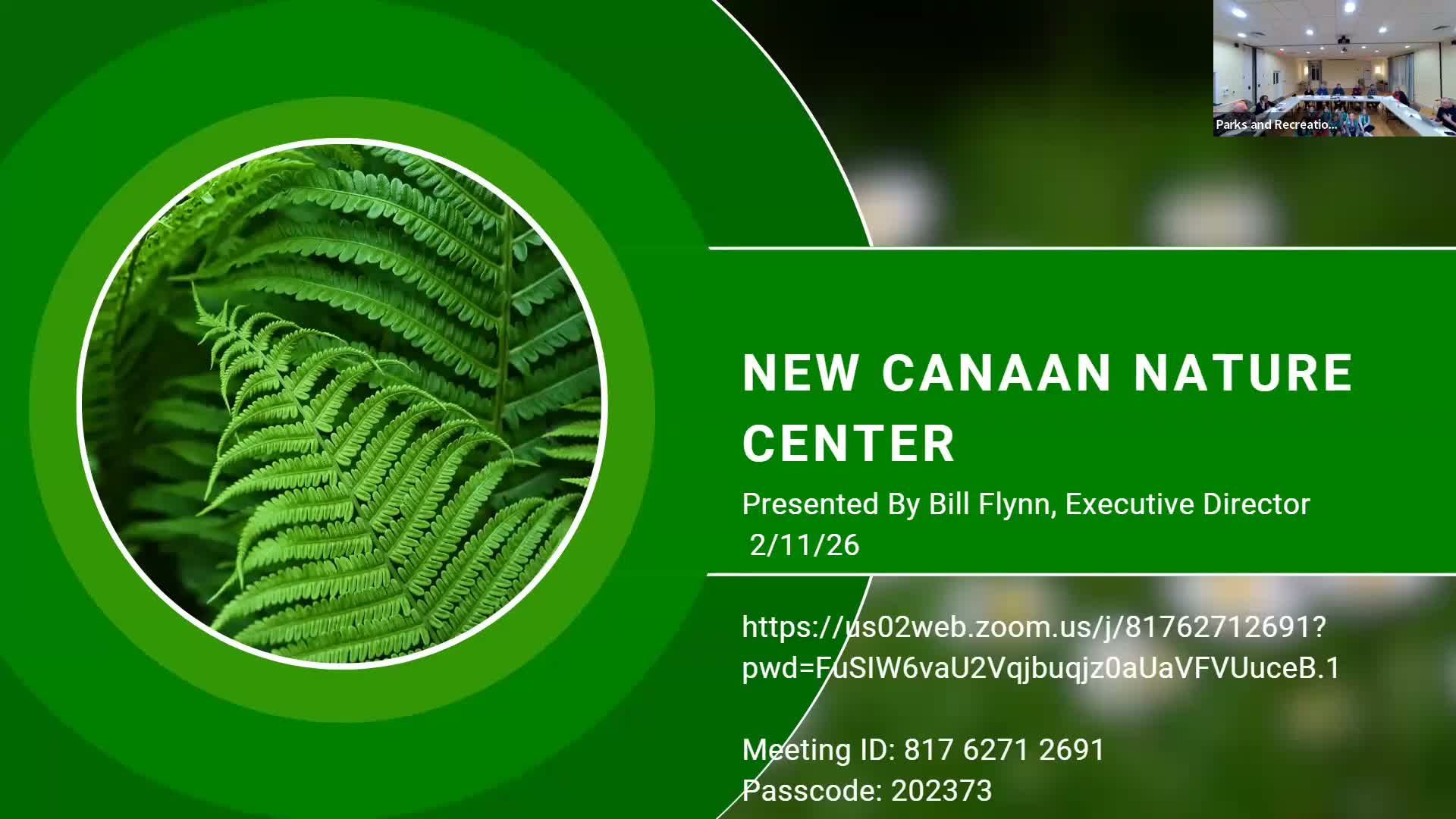 Bill Flynn, executive director of the New Canaan Nature Center, briefed the commission on program mix, last year’s audited finances, pond dredging and invasive‑species removal, and proposed a donor‑funded greenhouse, education building upgrades and other capital projects pending town approvals.