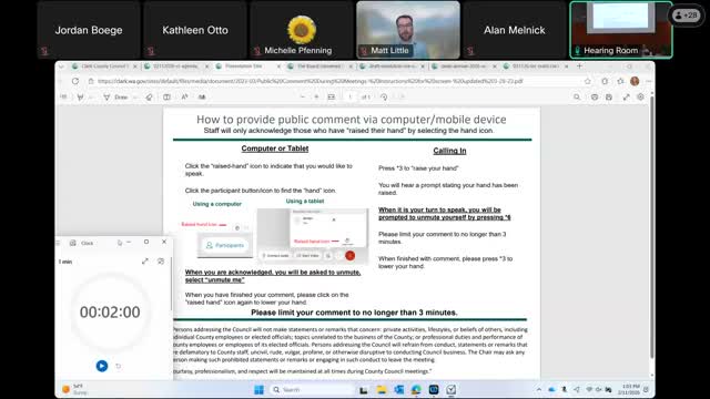 Chair Marshall opened the Feb. 11 meeting and allowed an extended public-comment period that focused largely on a proposed Clark County Council resolution clarifying the county's jurisdiction and its position on federal immigration enforcement.