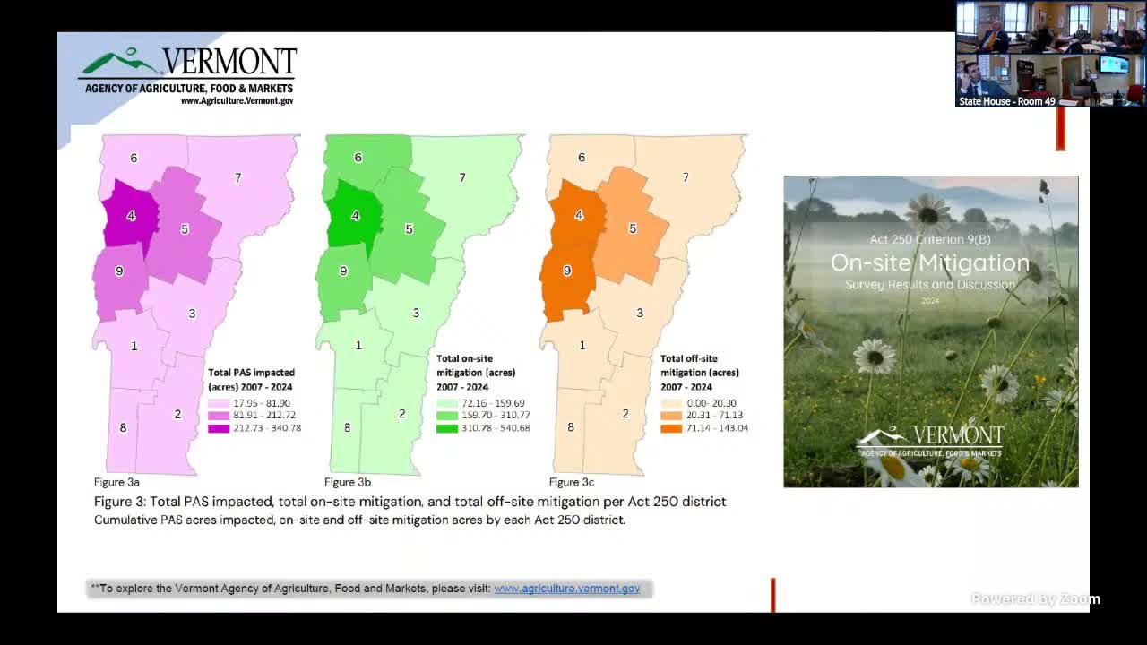 Members also raised fragmentation concerns: Miller said the agency accounts for indirect impacts such as fragmentation that isolates less than one acre or creates narrow strips (understood as less than 100‑foot widths) when calculating mitigation. Several members noted that long‑duration solar use (20–30 years) can effectively remove land from farming for a generation and asked whether lease‑style or short‑term easements could be used as mitigation strategies; Miller said VHCB and land‑trust approaches are sometimes used but emphasized the legal and practical complexities.