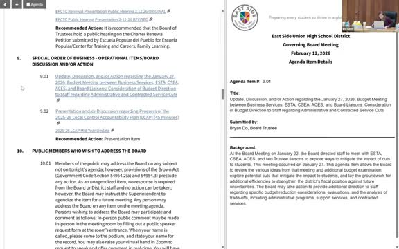 Following hours of public comment and trustee discussion at the Feb. 12 meeting, the Eastside Union High School District board directed staff to develop concrete options to reduce recurring, permanent expenditures while prioritizing protections for direct student services.