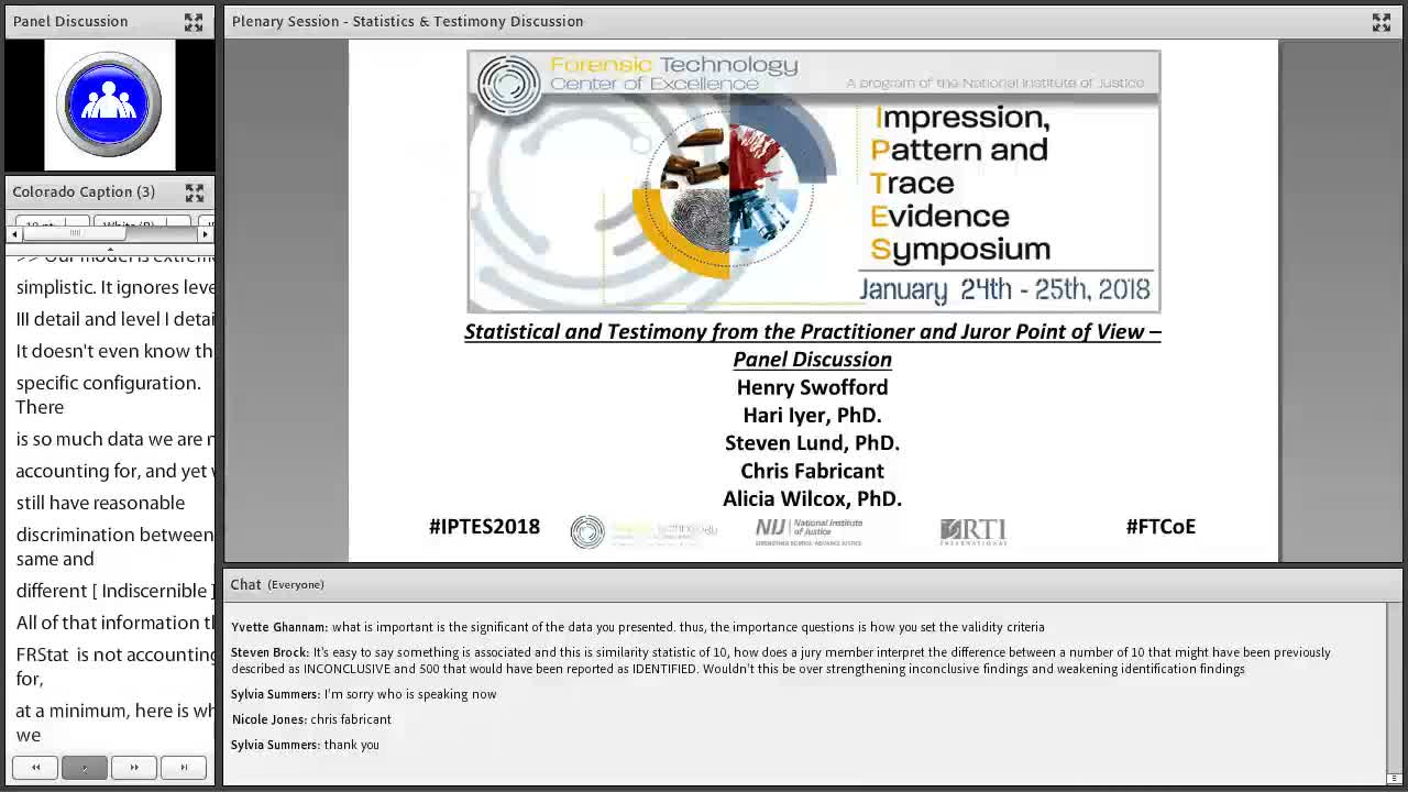 Jessica, a trace-evidence examiner who identified herself as "from the Pennsylvania State Police," asked how to raise jurors' perception of trace-evidence reliability beyond mere familiarity. She also asked whether laboratories should fund advanced degrees or rely on training and certification. "Do you think that is something that employers should invest in to increase the reliability or do you think they can counteract it by, for example, training and certifications?" she asked.
