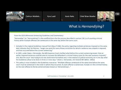 The Minnesota Sentencing Guidelines Commission on Feb. 12 began a detailed review of the Hernandez sentencing rule — informally called "hernandizing" — after staff presented data showing both the number and the share of sentences using the rule have increased over the last two decades.