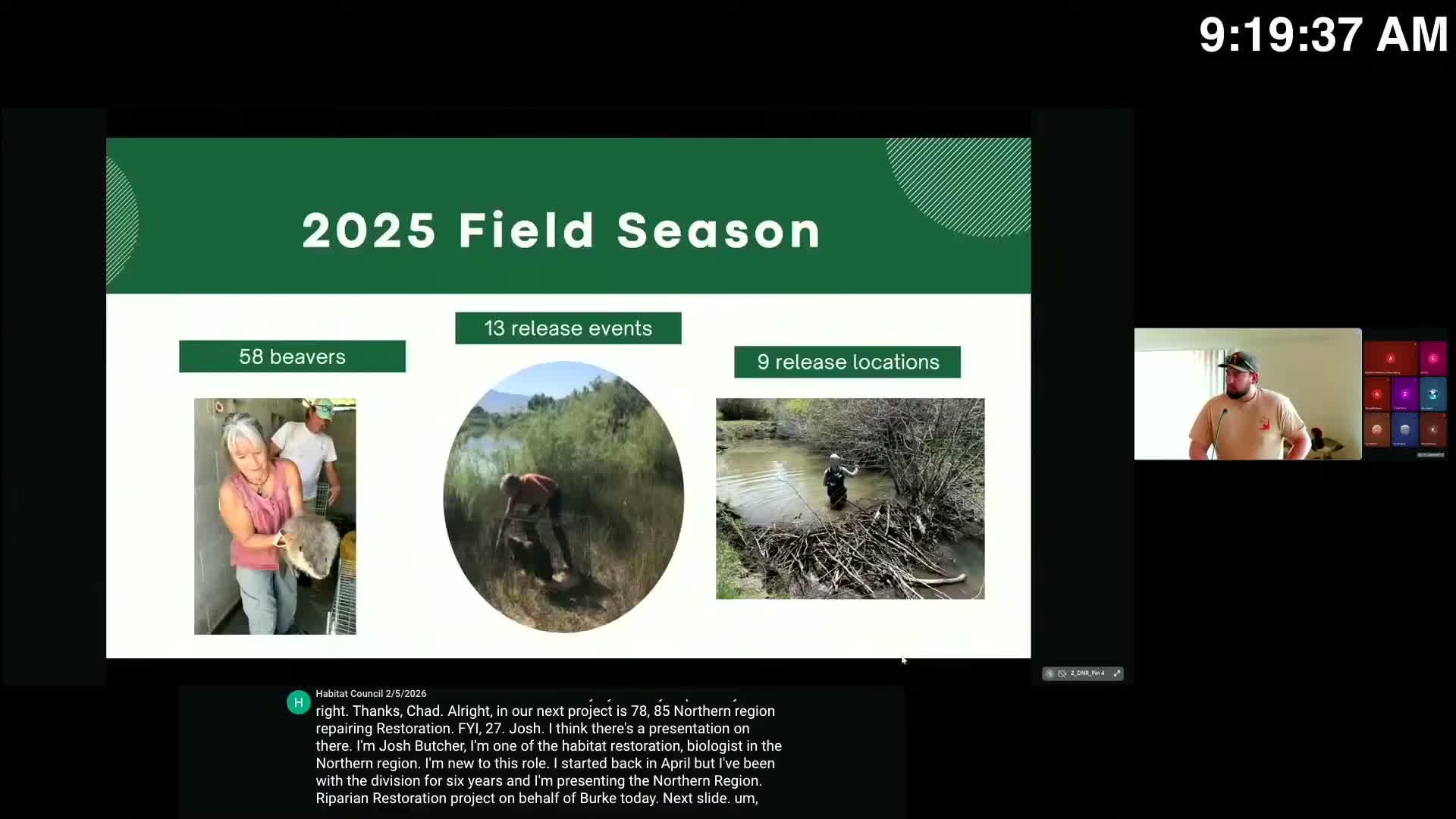Robbie Edgel (Central Region habitat restoration biologist) and Gary Besant (Southern Region habitat program manager) summarized regional beaver programs that aim to reintroduce beavers to priority drainages, maintain beaver dam analogs (BDAs), and expand living‑with‑beaver measures.