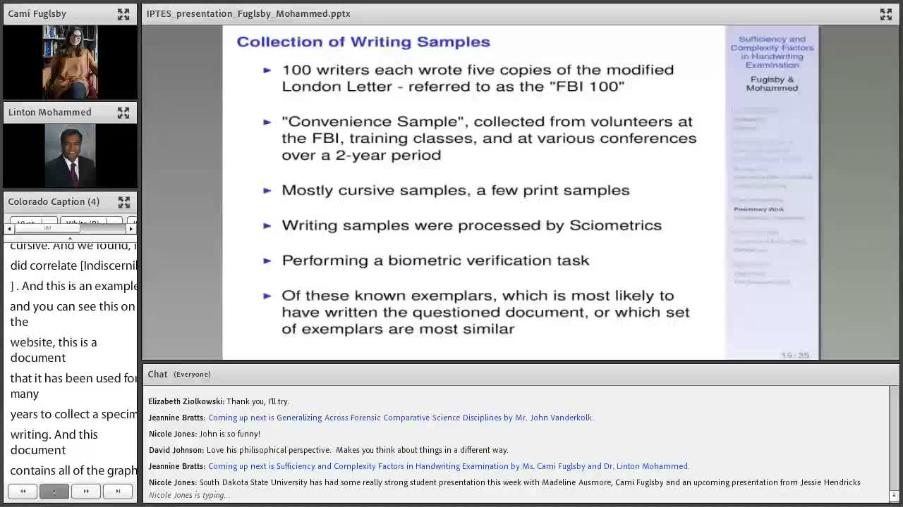 Presenters described the sample design ("FBI 100" convenience sample, Alabama samples), FlashID/Syometrics processing, and use of Pearson chi-square statistics to estimate error rates, cautioning short words and printing-versus-cursive differences limit some automated approaches.