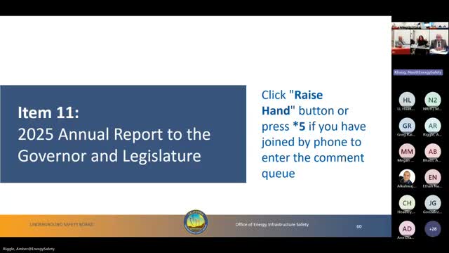 Staff also briefed the board on an SB 2 54 awareness and education implementation plan (four phases: outreach, awareness campaign, education, reporting) and the no-811 pilot that targets high-priority gas lines to better detect excavations without prior notification. The board approved the 2025 annual report for transmission to the Natural Resources Agency and the governor, noting that agency review could trigger revisions before final submittal.