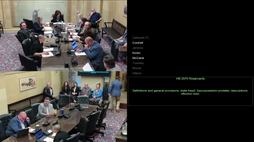 Representative Rosecrans’ House Bill 2970, to replace a previously listed state fossil reclassified as a chimera with Sauroposeidon protellus, passed the tourism committee; members discussed scientific reclassification and tourism opportunities tied to the Sam Noble Museum.