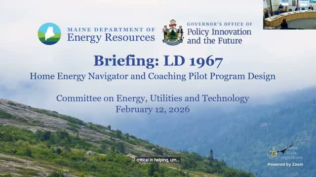 Staff from the Maine Department of Energy Resources and the Governors Office of Policy Innovation for the Future presented the Legislatures report responding to LD 1967 that designed options for a Home Energy Navigator and community-based energy coaching pilot.
